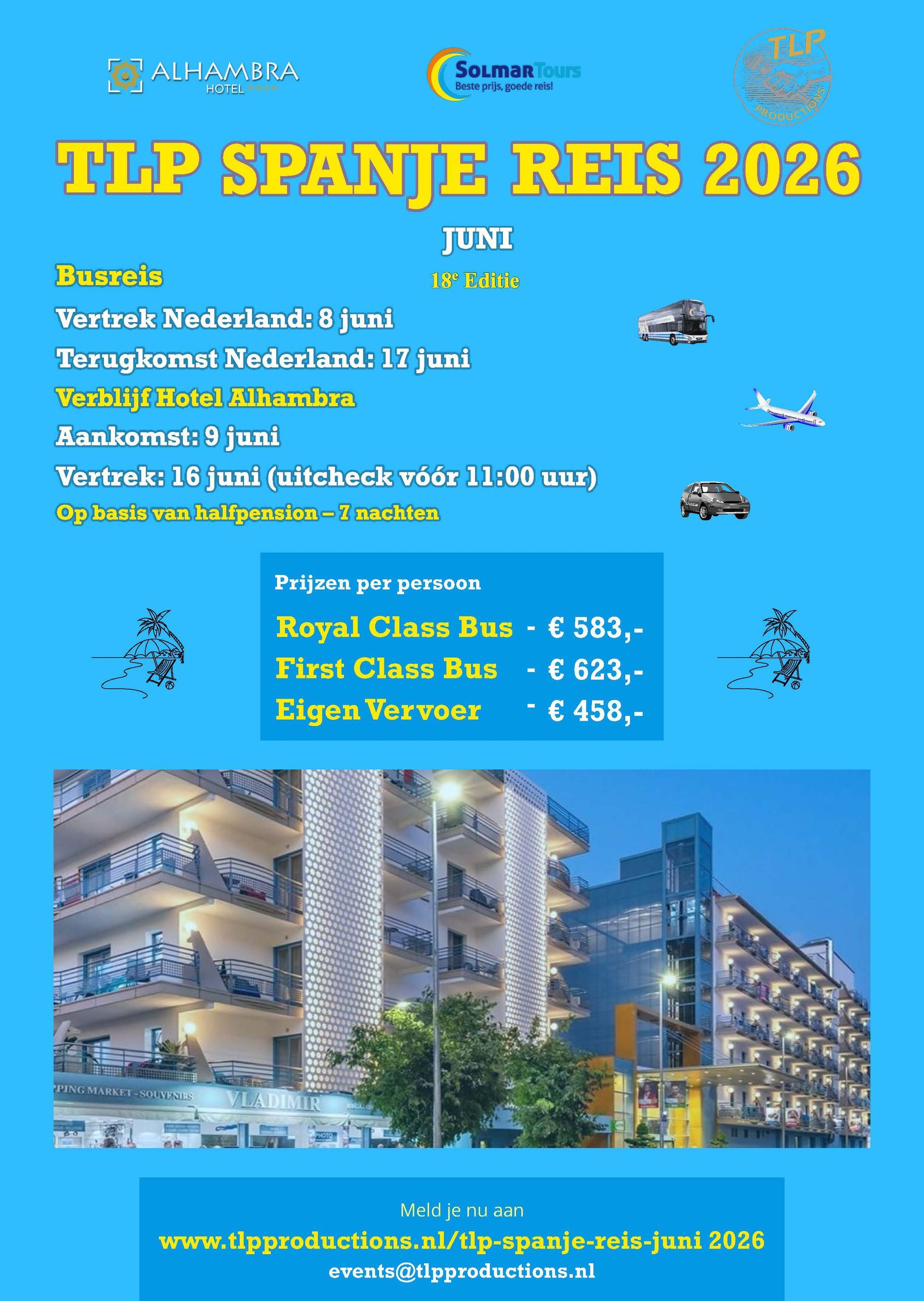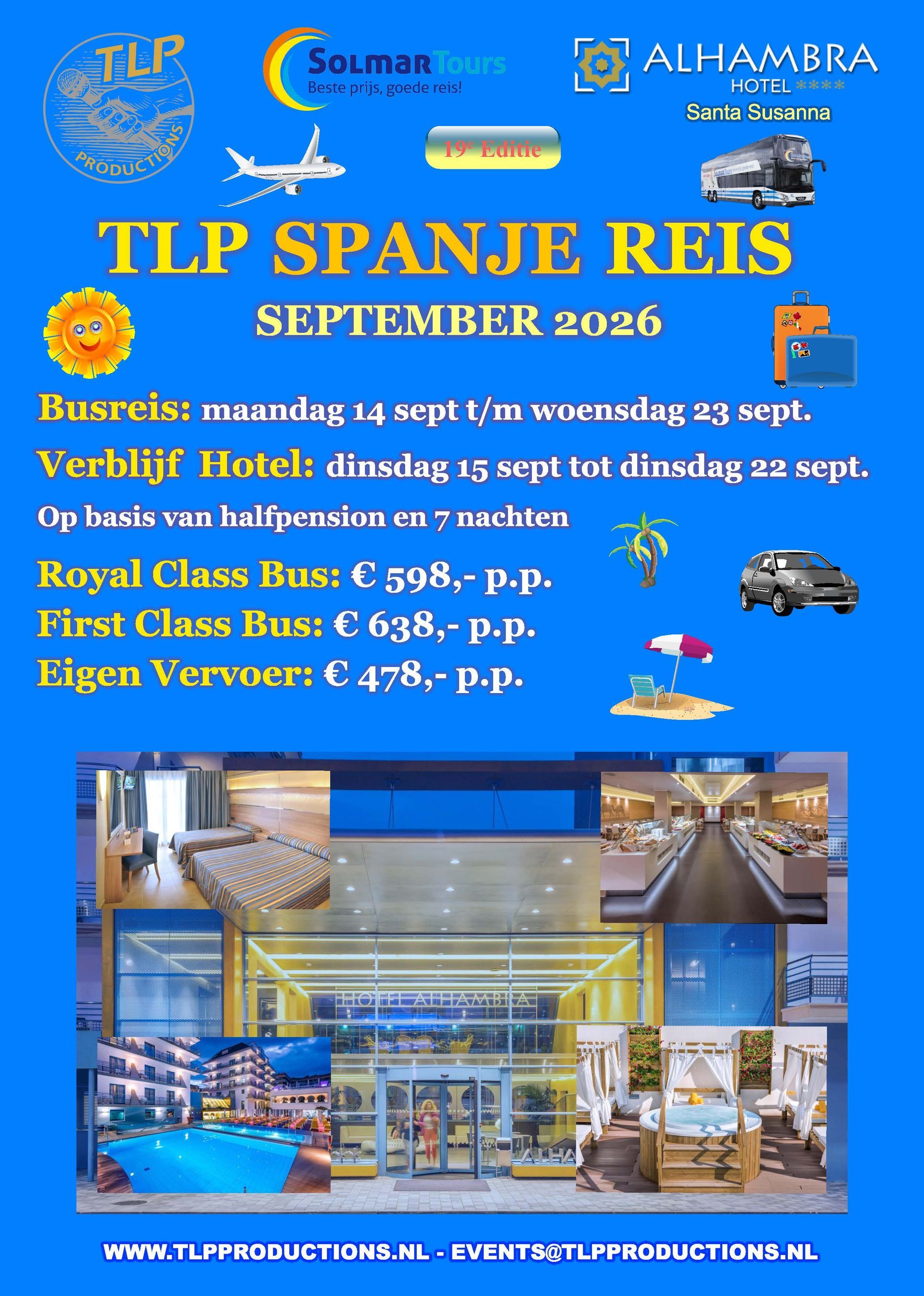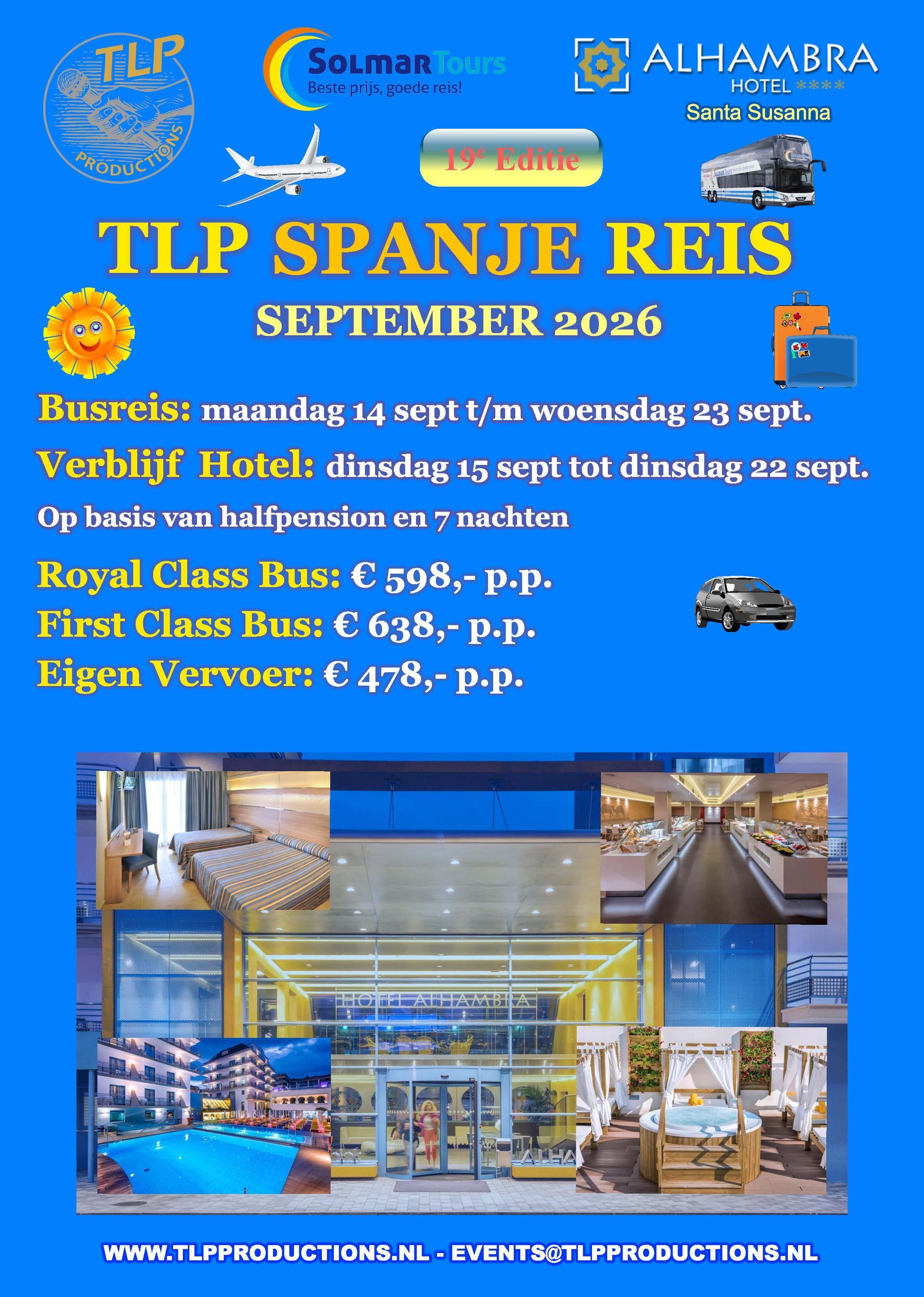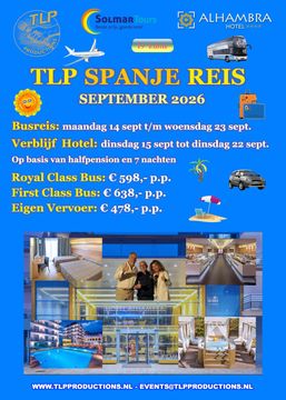 Ook in sept 2026 organiseert TLP Productions de 19e editie van de TLP Spanje Reis in het zonnige Hotel Alhambra!